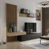 Material: melamine chipboard Edge material: paper impregnated with thermostetric polymers Colour: black/oak Artisan Dimensions (WxHxH): 249.5x42x199.5 cm Hanging cabinet (WxHxH): 110x33.7x16.1 cm Shelf (WxHxH): 140x20.4x26 cm TV table (WxHxH): 180x42.2x32.5 cm Laminated panel (WxW): 69.4x199.5 cm Material thickness: 1.6 cm Slats thickness: 2.2 cm With plastic legs The door opens with a ?push-up? Delivered disassembled