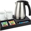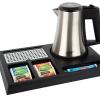 HEAT-RESISTANT ABS TRAY WITH ‘DRIP TRAY’ FOR USED TEA BAGS The STAY is a welcome tray that consists of durable ABS with a unique wood structure finish. A high-quality coffee and tea set that will show you that a plastic hospitality tray can look stylish! To save space on your desk or dresser, you can integrate an A5 leaflet holder. Furthermore this unique courtesy tray is equipped with a removable stainless steel 'drip tray' for used tea bags and spoons. The STAY is currently available in black. Made of heat-resistant ABS with a wood structure finish Available in stylish black color Removable stainless steel perforated ‘drip tray’ for used tea bags and spoons 3 compartments for presentation of condiments Anti-theft system for water kettle power base Easy to clean due to rounded edges Dimensions in mm: Tray: 356 x 240 x 38 (W x D x H) Height including STYLE kettle: 250 Compartments: (W x D x H) For tea bags: 69 x 104 x 20 (2x) For sugar/milk sticks: 140 x 35 x 20 (1x) Optional: Walküre cup STARQ and A5 leaflet holder Brand: Private label Material water kettle: Plastic with 304 stainless steel (brushed) Power (watt) STAR: 1.000W (energy efficient) STYLE: 1.500W Certificates CE, Intertek and Tüv/GS approved Wireless: Yes Wire length :73cm Plug Euro plug (2-pins) UK plug (3-pins) Swiss plug (3-pins) Heating element: Integrated Automatic shut off when boiling : Yes Anti-lime filter: Yes Suitable for right and left handed users: Yes, 360 degrees rotation Boil dry protection: Yes, overheating protection *cups & coffee machine are not included * Price does not include VAT