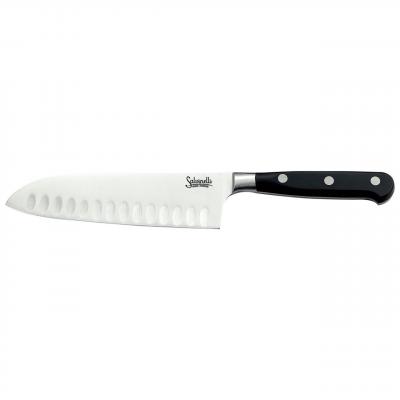 Cutit Oriental Santoku by Salvinelli – Performanta si Echilibru (16 cm) Experimentati arta taierii japoneze cu cutitul oriental Santoku by Salvinelli . Cu o lama de 16 cm , acest cutit versatil este conceput pentru cele trei utilizari esentiale in bucatarie: feliere, tocare si maruntire, fiind un instrument indispensabil atat pentru bucatarii profesionisti, cat si pentru entuziasti. Lama este prevazuta cu alveole speciale care creeaza perne de aer in timpul taierii, prevenind lipirea feliilor subtiri de lama si asigurand o alunecare fluida prin ingrediente delicate. Avantajele Cutitului Santoku Salvinelli: Design Oriental Autentic: Forma lamei ofera un echilibru perfect intre maner si varf, permitand o manevrabilitate sporita si un control total asupra taieturii. Lama Alveolata Eficienta: Orificiile de pe suprafata lamei reduc frictiunea, fiind ideal pentru felierea rapida a legumelor zemoase, a pestelui crud sau a carnii. Maner Ergonomic: Fixat cu nituri robuste, manerul ofera o priza sigura si confortabila, prevenind oboseala mainii in timpul utilizarii prelungite in laboratorul de gatit. Material de Inalta Calitate: Otelul utilizat de Salvinelli asigura o retentie excelenta a taisului si o rezistenta ridicata la coroziune, pastrandu-si calitatile in timp. Versatilitate Maxima: Desi este un cutit de inspiratie asiatica, se adapteaza perfect oricarui stil de gatit, inlocuind cu succes cutitul bucatarului clasic in sarcini de precizie. Specificatii Tehnice: Lungime lama: 16 cm Tip lama: Santoku (orientala) cu alveole Brand: Salvinelli Constructie: Lama cu nituri si finisaj premium Utilizare: Feliere, tocare, maruntire (legume, carne, peste)