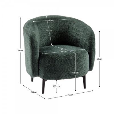 Material: fabric Abriamo Bouclé 09 Fabric strength according to Martindale test: 45,000 friction cycles Dimensions (WxDxH): 75x68x76 cm Upholstery color: green Filling: corrugated springs + PUR T30 foam Feet material: metal Foot color: black Lower compartment height from floor: 17.5 cm Backrest height: 35 cm Backrest width: 41 cm Seat height: 44 cm Seat depth: 50 cm Seat width: 53 cm Armrest height: 61 cm Load capacity: 120 kg Design Fully upholstered hardly flammable fabric Delivered disassembled The possibility to choose from 6 shades of Abriamo Bouclé fabric at the price of 1,135 Lei. For personalized orders, an advance payment of 10% of the total amount is required. After paying the advance, your order will go into production. Delivery time is 6-8 weeks.