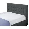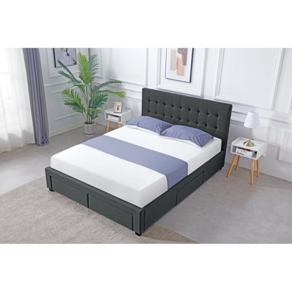 Material: Melamine MDF/velvet fabric Resistance of the fabric to friction according to the Martindale test: 80000 friction cycles Colour: grey Dimensions (WxHxH): 190x218x105 cm Sleeping surface (WxW): 180x200 cm Height to bed base: 31.2 cm Height of the side: 30 cm Mattress recess: 3.8 cm Load capacity per person: 250 kg On legs Leg height: 5 cm Foot colour: black Leg material: pine wood With storage space Four drawers Smaller drawer interior dimensions (WxHxHxH): 58x48x14 cm Larger drawer interior dimensions (WxHxHxH): 74x48x14 cm Drawer load: 8 kg Supplied with slatted bed base Space between slats: 5 cm Delivered without mattress We recommend that you purchase a mattress from our offer Recommended mattress height: 20 cm Decorative Quilted Headboard Elegant Upholstered Delivered disassembled