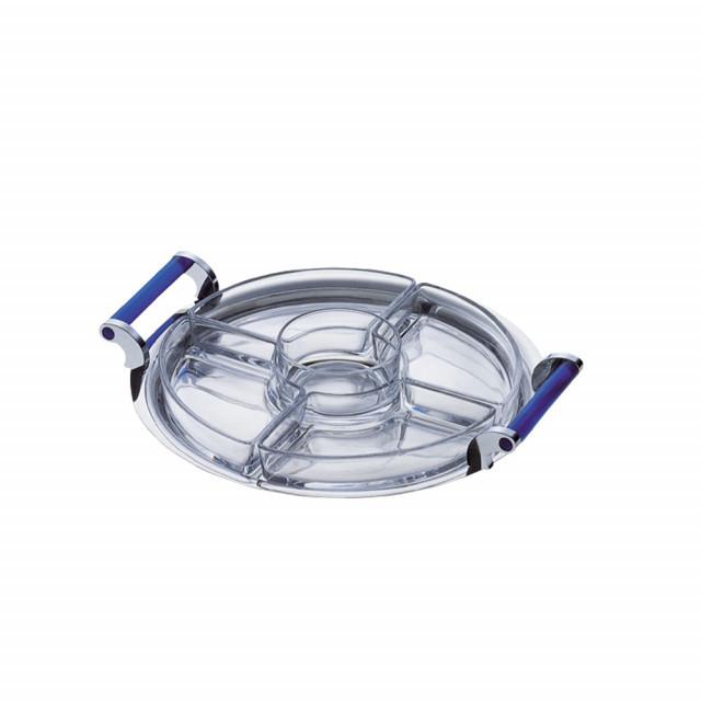 Stainless steel plate with handles with blue acrylic insert and transparent acrylic compartments for appetizers. Stainless steel glossy 18/10. Diameter 30 cm