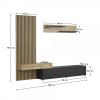Material: Melamine chipboard Edge material: paper impregnated with thermosetting polymers Color: black/oak Artisan Dimensions (WxDxH): 249.5x42x199.5 cm Hanging cabinet (WxHxH): 110x33.7x16.1 cm Shelf (WxDxH): 140x20.4x26 cm TV table (WxDxH): 180x42.2x32.5 cm Lamellar panel (WxD): 69.4x199.5 cm Material thickness: 1.6 cm Blade thickness: 2.2 cm With plastic legs The door opens with a push-up mechanism? Delivered disassembled.