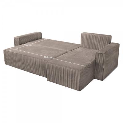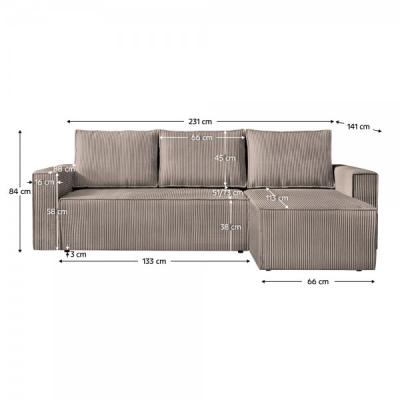 Material: ţesătură Poso 2 Rezistenţa ţesăturii la frecare conform testului Martindale: 90 000 de cicluri de frecare Culoare: gri-bej Taupe Dimensiuni (lxAxh): 231x141x84 cm Suprafaţa pentru dormit (lxL): 136x200 cm Înălţimea părţii de şezut: 38 cm Adâncimea părţii de şezut: 51/73 cm Dimensiuni otoman (lxA): 66x113 cm Dimensiuni cotieră (lxAxh): 16x88x58 cm Lăţimea părţii de şezut: 133 cm Universală Complet tapiţată Extensibilă De colţ Cu spaţiu de depozitare Pe picioare Material picioare: plastic Culoare picioare: argintiu Înălţimea spaţiului inferior faţă de podea: 3 cm Miezul scaunului: arc bonell Cu perne Dimensiunile pernelor (lxh): 66x45 cm Practic Modern Livrat dezasamblat Vă oferim posibilitatea de a alege din 7 versiuni de culoare ale ţesăturii Poso
