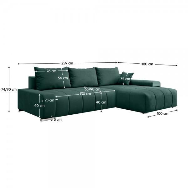 Material: ţesătură Monolith 37 Rezistenţa ţesăturii la frecare conform testului Martindale: 100 000 de cicluri de frecare Culoare: smarald Dimensiuni (lxAxh): 259x180x74/90 cm Extensibilă Suprafaţa pentru dormit (lxL): 137x212 cm Înălţimea părţii de şezut: 40 cm Adâncimea părţii de şezut: 65/90 cm Lăţimea părţii de şezut: 130 cm Lăţime otoman: 100 cm Cu picioare Materialul picioarelor: plastic Culoare picioarelor: argintiu Înălţimea compartimentului inferior de la podea: 5 cm Umplutură: arc falista/spumă PUR Design universal Complet tapiţată De colţ Cu spaţiu de depozitare Livrat cu perne Dimensiuni perne decorative (lxh): 35x35 cm Dimensiunile pernei de sprijin (lxh): 76x56 cm Material impermeabil Decorativ matlasat Livrată dezasamblată Posibilitatea de comenzi individuale ale setului de canapele în 6 culori de ţesătură Monolith .