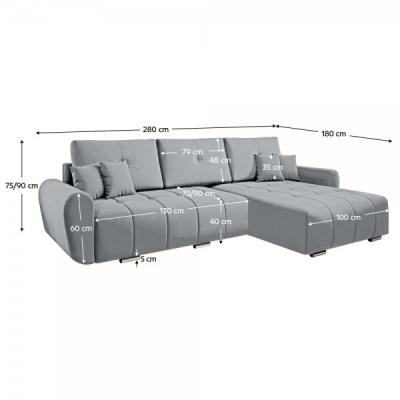 Material: ţesătură Monolith 84 Rezistenţa ţesăturii la frecare conform testului Martindale: 100 000 de cicluri de frecare Culoare: gri deschis Dimensiuni (lxAxh): 280x180x75/90 cm Suprafaţa extensibilă pentru dormit (lxL): 134x230 cm Înălţimea părţii de şezut: 40 cm Adâncimea părţii de şezut: 70/90 cm Lăţimea părţii de şezut: 130 cm Lăţime otoman: 100 cm Cu picioare Materialul picioarelor: plastic Culoare picioarelor: argintiu Înălţimea compartimentului inferior de la podea: 5 cm Umplutură: arc falista/spumă PUR Design universal Complet tapiţată De colţ Cu spaţiu de depozitare Livrat cu perne Dimensiuni perne decorative (lxh): 35x35 cm Dimensiunile pernei de sprijin (lxh): 79x48 cm Material impermeabil Decorativ matlasată Livrată dezasamblată Posibilitatea de comenzi individuale ale setului de canapele în 7 culori de ţesătură Monolith sunt posibile.