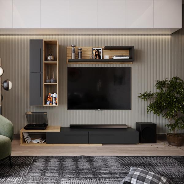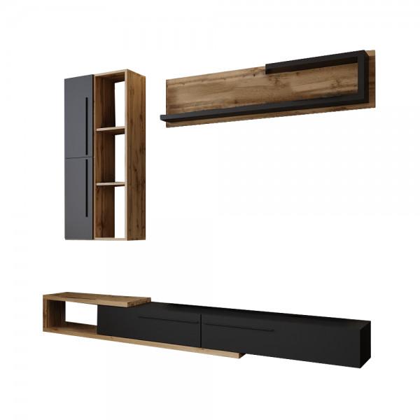 Material: PAL melaminat Material margini: hârtie impregnată cu polimeri termorigizi Culoare: stejar Tacho / antracit Dimensiuni (LxAxÎ): 210x38x200 cm Dulap suspendat (LxAxÎ): 51x31,6x120 cm Raft (LxAxÎ): 130x18,6x34 cm Măsuţă TV (LxAxÎ): 210x37,5x27,9 cm Lăţimea extensiei de pe măsuţa TV: 70 cm Grosime material: 1,6 cm Cu picioare din plastic Mânere din plastic Uşa se deschide cu ajutorul balamalelor - SLID-ON Vă recomandăm să ataşaţi mobilierul de perete Livrat dezasamblat
