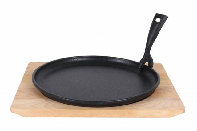 Tigaie din fonta pentru servire diametru 26 cm, cu suport din lemn de dimensiuni 30x25.5 cm. Maner detasabil