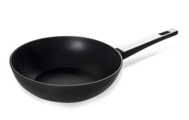 Tigaie wok din aluminiu acoperire non-stick de grosime 3 mm, diametru 28 cm, inaltime 8 cm; lungime cu maner 47 cm; utilizabil pentru gaz, electric, vitroceramic, halogen si inductie