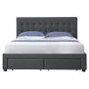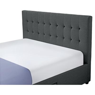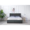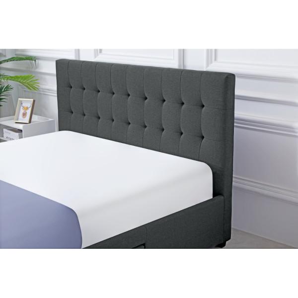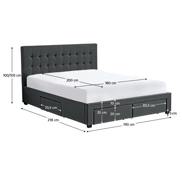 Material: MDF melaminat/ţesătură velvet Rezistenţa ţesăturii la frecare conform testului Martindale: 80000 de cicluri de frecare Culoare: gri Dimensiuni (lxAxh): 190x218x105 cm Suprafaţa pentru dormit (lxL): 180x200 cm Înălţimea până la somieră: 31,2 cm Înălţimea lateralei: 30 cm Încastrarea saltelei: 3,8 cm Portanţă pe persoană: 250 kg Pe picioare Înălţime picioare: 5 cm Culoarea piciorului: negru Material picior: lemn de pin Cu spaţiu de depozitare Patru sertare Dimensiunile interioare ale sertarului mai mic (lxAxh): 58x48x14 cm Dimensiunile interioare ale sertarului mai mare (lxAxh): 74x48x14 cm Portanţă sertar: 8 kg Livrat cu somieră cu lamele Spaţiu între lamele: 5 cm Livrat fără saltea Vă recomandăm să achiziţionaţi o saltea din oferta noastră Înălţimea recomandată a saltelei: 20 cm Tăblie frontală matlasată decorativ Elegant Tapiţat Livrat dezasamblat