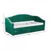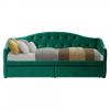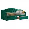 Material: ţesătură catifea/DTD/MDF/furnir laminat Rezistenţa la abraziune a ţesăturii conform testului Martindale: 70 000 de cicluri de frecare Culoare: verde Dimensiuni (Lxlxh): 217x95x95 cm Suprafaţa pentru dormit (Lxl): 90x200 cm Tapiţată Spaţiu de depozitare Două sertare Dimensiunea sertarului interior (Lxlxh): 37x91,4x14,8 cm Portanţa sertarului: 5 cm Portanţa pe loc de dormit: 150 kg Livrat cu 2 grătare cu lamele Înălţimea grătarului de la sol: 36,5 cm Livrat fără saltea Vă recomandăm să cumpăraţi o saltea din oferta noastră Laturi şi cap de pat decorative cusute Pe picioare Livrat dezasamblat